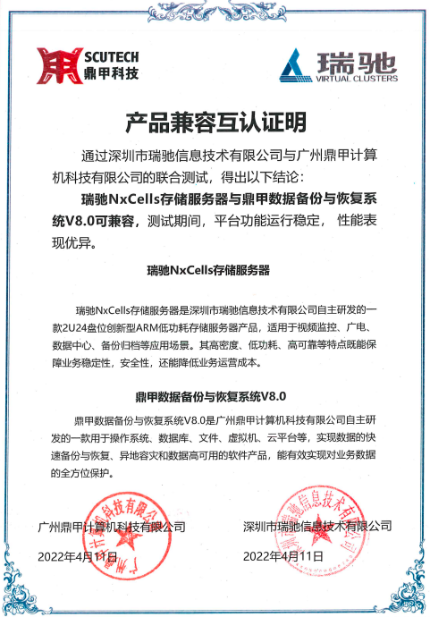 近日,鼎甲科技與瑞馳完成產(chǎn)品兼容互認證。本次兼容性互認證經(jīng)瑞馳與鼎甲科技雙方聯(lián)合測試得出:瑞馳NxCells存儲服務器與鼎甲數(shù)據(jù)備份與恢復系統(tǒng)V8.0可兼容,測試期間,平臺功能運行穩(wěn)定,性能表現(xiàn)優(yōu)異。
