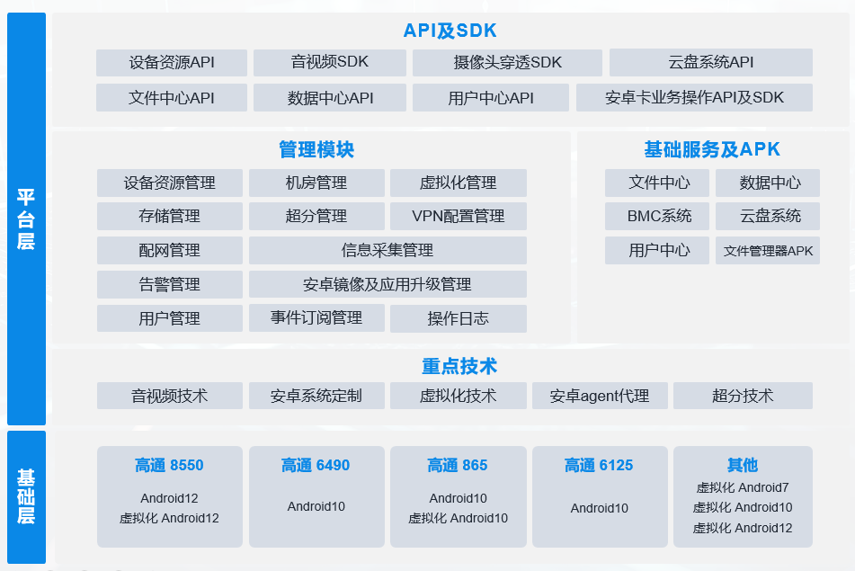 瑞馳搭載高通8550、6490、865、6125等板卡打造的新型算力基礎平臺,具備虛擬化開發(fā)能力、安卓系統(tǒng)軟件能力、音視頻開發(fā)能力、存儲能力和基于ARM架構的計算能力。