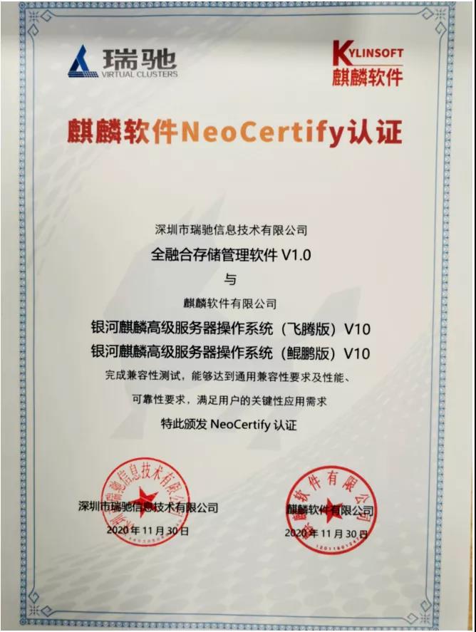 近日,瑞馳與麒麟軟件完成產品兼容性互認證。經測試,瑞馳全融合存儲管理軟件V1.0能夠在銀河麒麟高級服務器操作系統(tǒng)V10(飛騰版/鯤鵬版)上穩(wěn)定運行,滿足通用兼容性要求及性能、可靠性要求,滿足用戶的關鍵性應用需求。