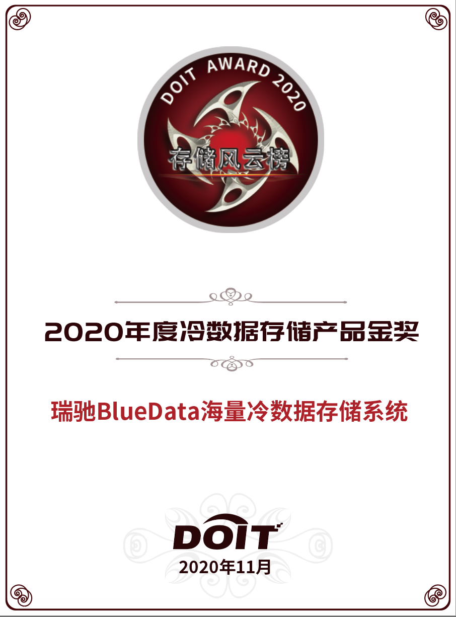2020年12月22日,百易傳媒發(fā)布了2020存儲風(fēng)云榜榜單,瑞馳Bluedata海量冷數(shù)據(jù)存儲系統(tǒng)榮獲年度冷數(shù)據(jù)存儲產(chǎn)品金獎。