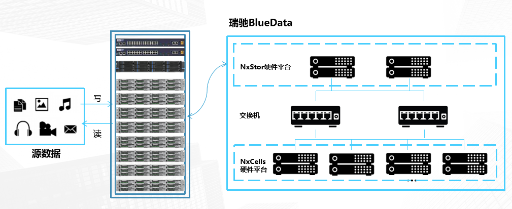 Bluedata海量冷數(shù)據(jù)存儲系統(tǒng),整體主要以NxStor高性能存儲節(jié)點(diǎn)及NxCells高密度低功耗存儲節(jié)點(diǎn)為基礎(chǔ)硬件平臺,通過BlueData智能存儲管理系統(tǒng)統(tǒng)一管理,目前這一產(chǎn)品主要應(yīng)用于視頻云存儲場景中。