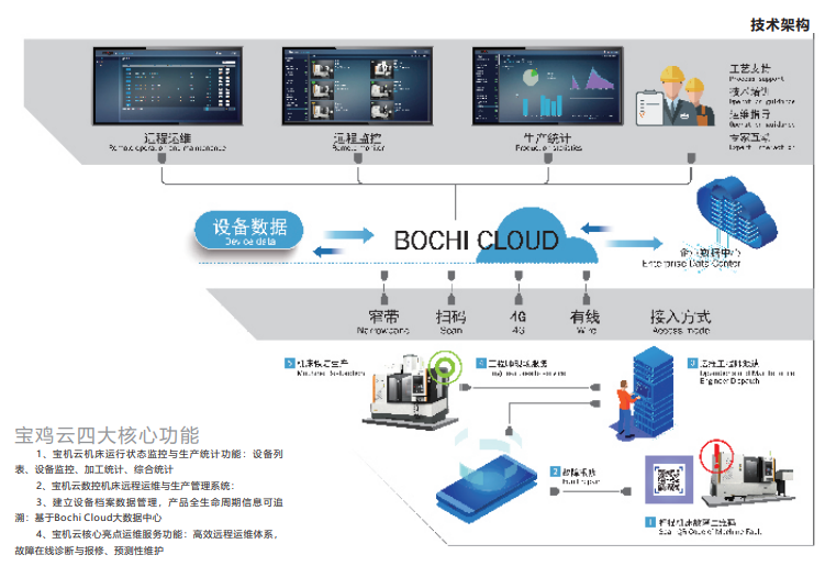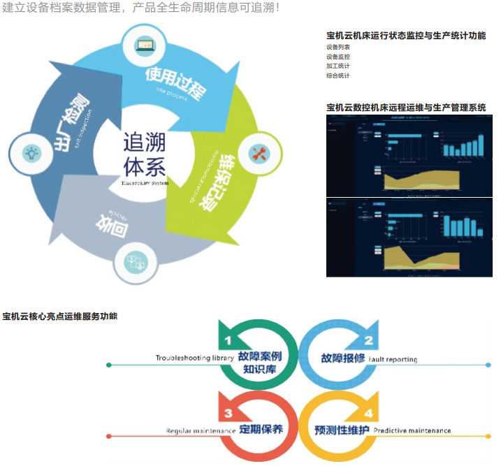 寶機(jī)云是寶雞機(jī)床數(shù)控機(jī)床全生命周期管理服務(wù)平臺。寶機(jī)云對機(jī)床數(shù)據(jù)等進(jìn)行遠(yuǎn)程采集,通過對機(jī)床大數(shù)據(jù)的分析和處理,實現(xiàn)基于機(jī)床大數(shù)據(jù)、云計算的智能化增值服務(wù)。如,面向車間管理人員的機(jī)床狀態(tài)和生產(chǎn)數(shù)據(jù)可視化,提高生產(chǎn)管理的便捷和時效;面向用戶設(shè)備的遠(yuǎn)程運維,提高服務(wù)質(zhì)量和效率,為用戶減少停機(jī)時間,降低使用成本等等,最終實現(xiàn)企業(yè)產(chǎn)品轉(zhuǎn)型升級和價值鏈的延伸。獲取更多信息