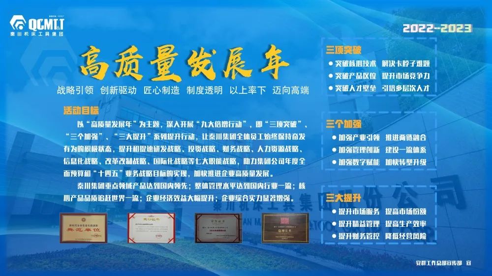 確定2022-2023年為集團(tuán)“高質(zhì)量發(fā)展年”,發(fā)布了《“高質(zhì)量發(fā)展年”(2022—2023年)實(shí)施方案》,明確了“高質(zhì)量發(fā)展年”活動(dòng)實(shí)施內(nèi)容及考核辦法。