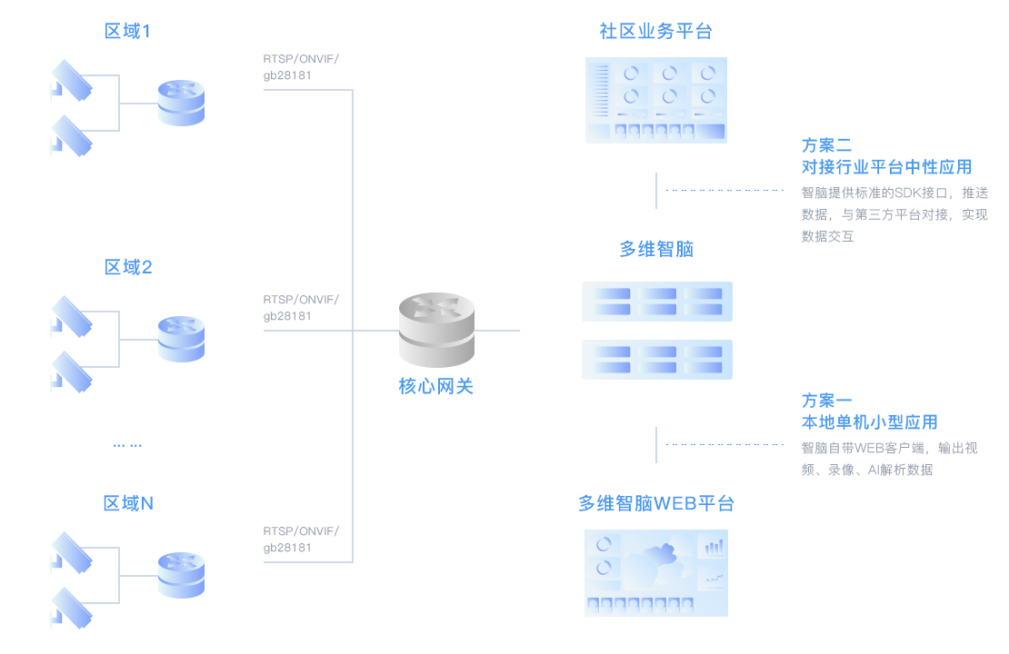 瑞馳不但給合作伙伴提供智慧社區(qū)/園區(qū)所需的邊緣人臉?biāo)惴ā⑷繕?biāo)結(jié)構(gòu)化和智能視頻分析的算法,滿足老社區(qū)攝像頭的利舊賦能升級,還可以提供多維智腦一體機(jī),滿足視頻監(jiān)控,視頻存儲以及算法賦能一體化解決方案。